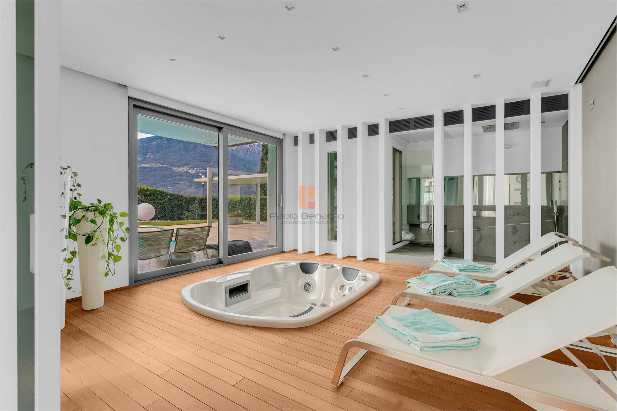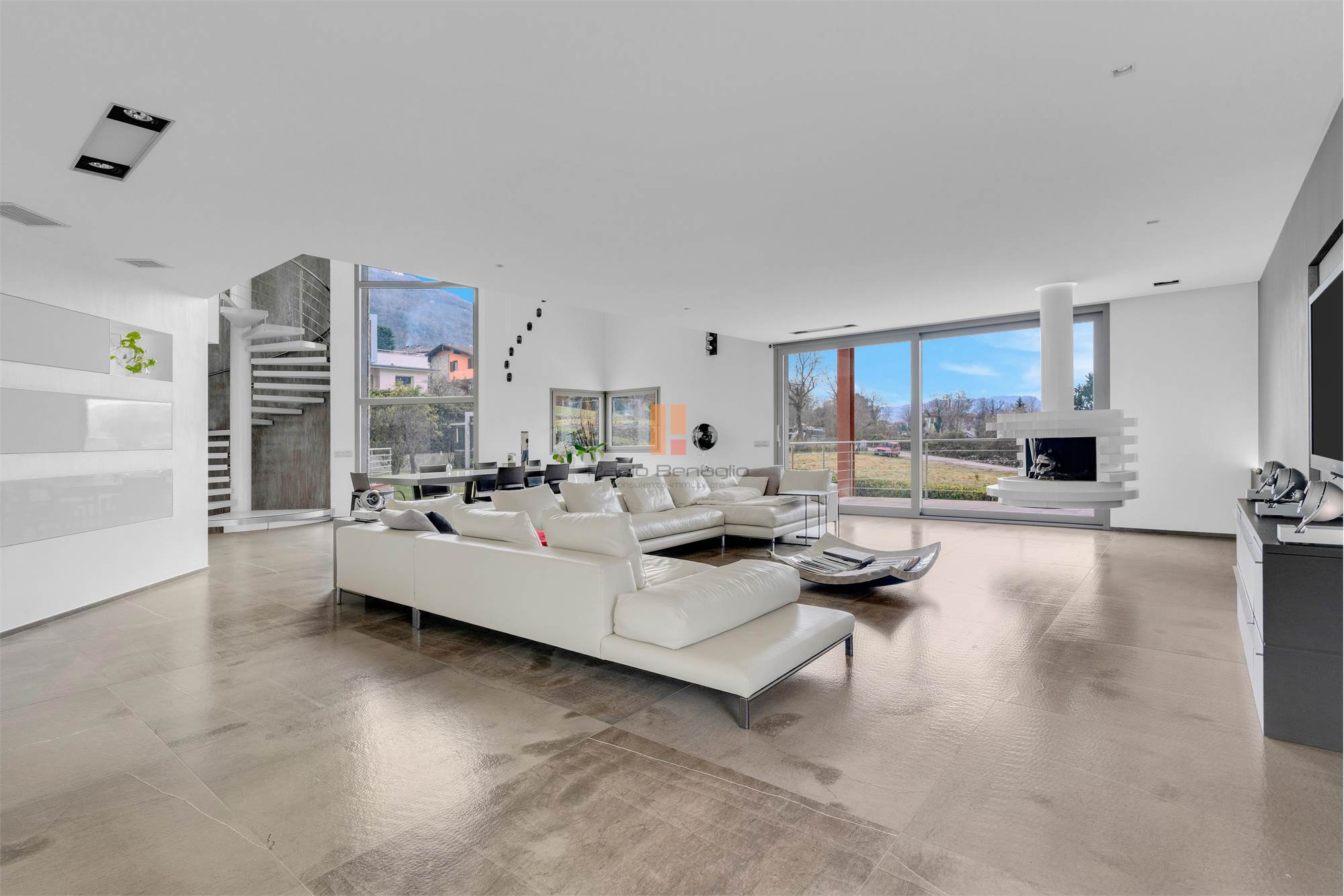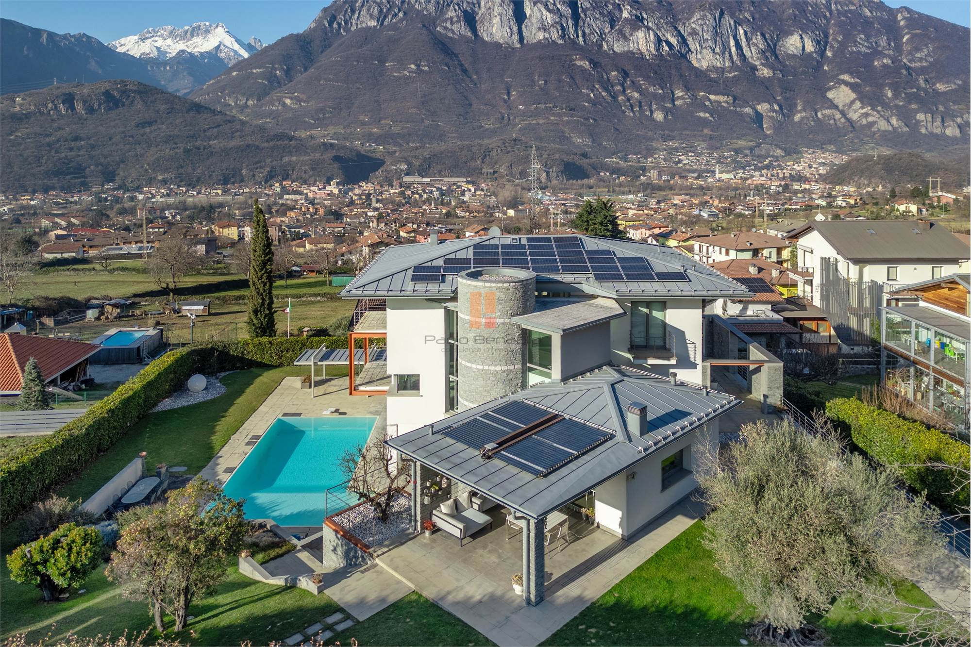 In zona Fucine, in posizione panoramica, proponiamo in vendita recente villa singola dall'architettura minima e dalle preziose finiture. Il fabbricato è disposto su tre piani collegati da una scenografica scala a chiocciola. Dal piano terra, accediamo all'ingresso, all'ampia e luminosa zona living servita da bagno e stanza ricreativa. Dal soggiorno accediamo poi alla spaziosa cucina abitabile con isola e tavolo da pranzo con accesso diretto al portico/dehor completamente attrezzato per una vivibilità estiva. Salendo la scala a vista accediamo alla zona notta che da un soppalco con vista sulla zona giorno ci porta alle tre ampie camere, la matrimoniale con bagno padronale e cabina armadio, una sala da bagno e sul fondo dell'ampio corridoio, uno spettacolare bow window con vista sullo skyline delle montagne. Al piano semi-interrato troviamo una zona spa con idromassaggio, bagno turco, doccia emozionali con elegante pavimentazione in teak. Sempre a questo piano troviamo un'insolita cantina attrezzata per piacevoli merende con degustazione, una grande zona ricreativa con cucina e zona living con accesso diretto alla piscina esterna, oltre ad un bagno un'ampia lavanderia e una zona fitness. Completa la proprietà un ampio box triplo e un vano tecnico con centrale geotermica e fotovoltaica. L'ampio giardino circostante dispone di uno spazio dedicato al barbecue attrezzato con lavandino e ampio bancone in acciaio. La villa viene proposta in vendita completamente arredata. SI VALUTA ANCHE PERMUTA
